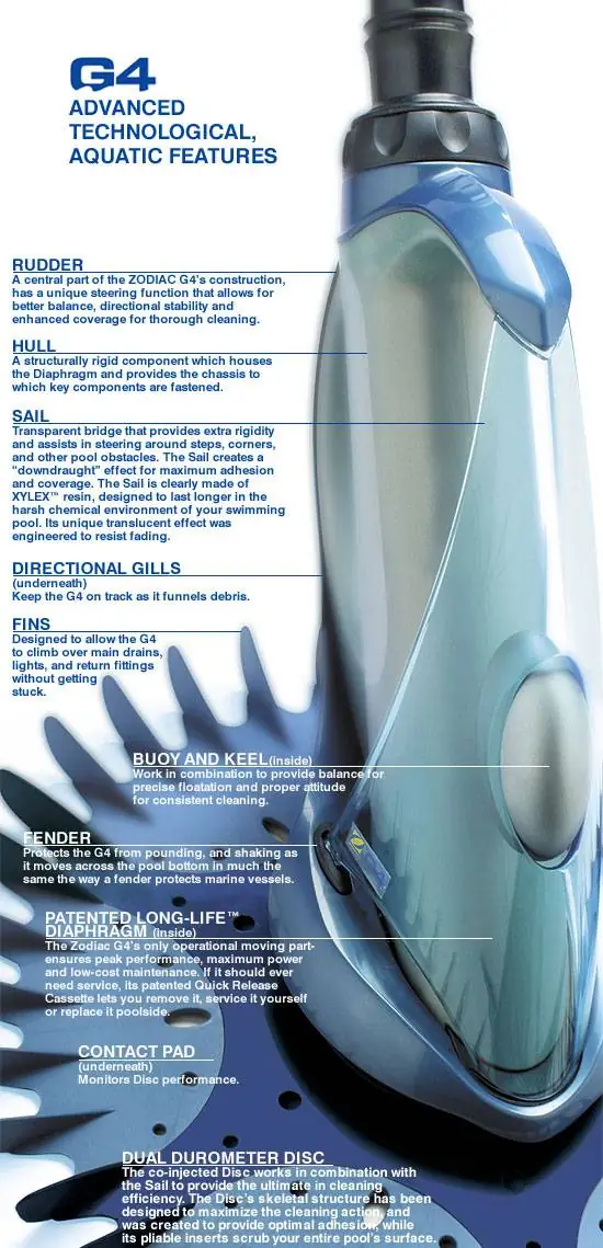 Advanced design make the G4 quieter than “flapper-style" cleaners. The unit comes complete with cleaning head and 39-ft. of hose. Backed by a 2-Year Warranty against manufacturer defects and wear and tear. Invest in the ultimate pool cleaner this season with the unparalleled G4.