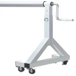 The reel height is adjustable up so you can operate it easily without kneeling and the 32" wide base ensures maximum stability. Four locking casters on each end add to the wheels stability and make it easy to roll out of the way when not in use. Our commercial grade reel comes complete with casters, blanket attachment kit and is easy to assemble. 1-Year warranty. Ships FedEx.