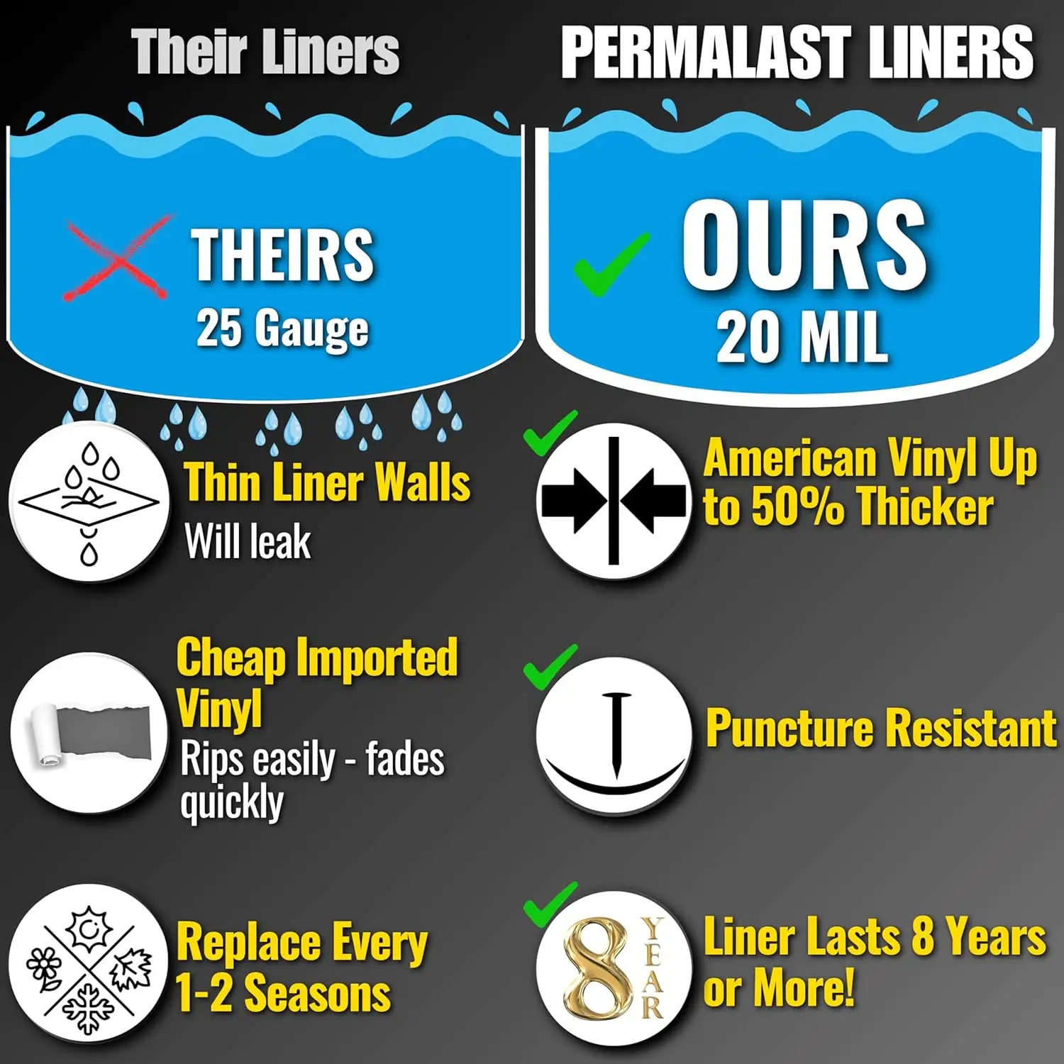 Here 's the deal: 'mil' is just a fancy way of saying thickness. This liner is a full 20 thousandths of an inch thick - up to 50% thicker than the thin stuff you usually see on liners marketed by 20ga Industry Standary or Heavy 25 Gauge Liners above ground pools. That extra material means it fights punctures, stretches without tearing, and handles wear and tear like a champ.
