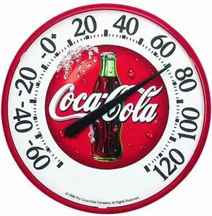 Beautiful weather-proof Thermometers will brighten up any pool area. Big 12- 1/2" faces have oversized numbers for easy viewing from across the pool. Thermometers register Centigrade and Fahrenheit scales. Beautiful and colorful Coke Bottle design, also available in a Classic Coke 5-cent design, Tropical Fish design and Water Refraction design. We also have outdoor, weather proof, clocks featuring some of the same designs. One 'AA' battery required (not included) with clocks
