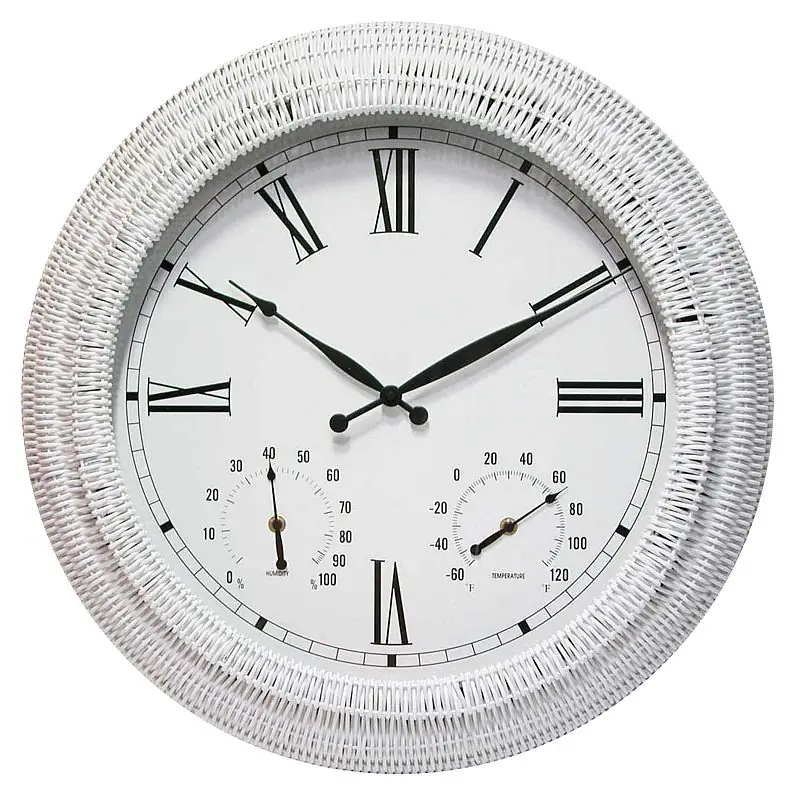 The Boca Rattan Outdoor Clock is a beautiful timepiece with a Faux Wicker finsih. This clock is suitable for indoor or outdoor use and has a white dial face with thermometer and hydrometer. The clock offers large, easy to read Roman numerals, black colored hands, and a glass face. A simple and stunning decorative clock for any home or office, this indoor / outdoor metal clock measures 24 in diameter and 3" deep, and requires 1 AA battery. 1 Year Limited Manufacturer's Warranty